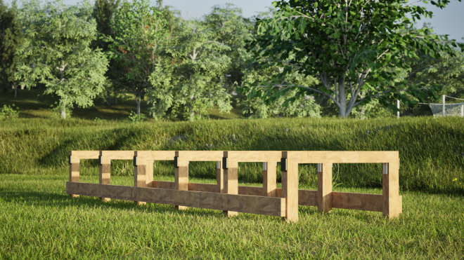 Táto zostava je vyrobená z kvalitného modřínu a recyklovaného HDPE, čo zaručuje vysokú odolnosť voči poveternostným vplyvom a dlhú životnosť. Spojenie prírodného dreva a moderných recyklovaných materiálov vytvára pevný a zároveň esteticky príjemný prvok.
