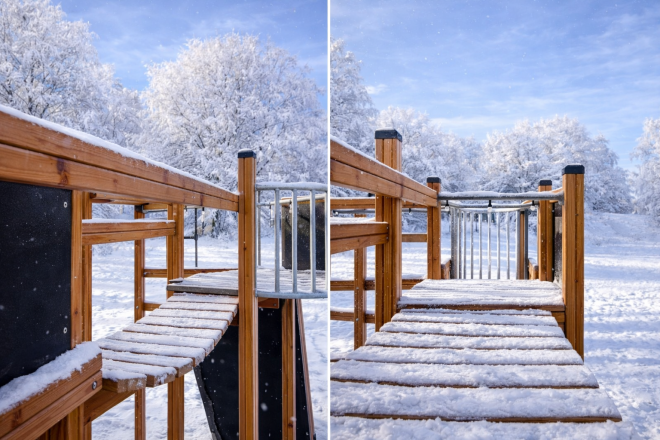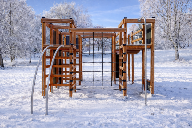 Táto zostava je ideálna pre vonkajšie ihriská, parky a školské areály, kde podporuje fyzický rozvoj detí, ich odvahu a motorické zručnosti. Prírodný vzhľad zároveň harmonizuje s okolitou prírodou a vytvára príjemnú atmosféru pre aktívne trávenie voľného času.