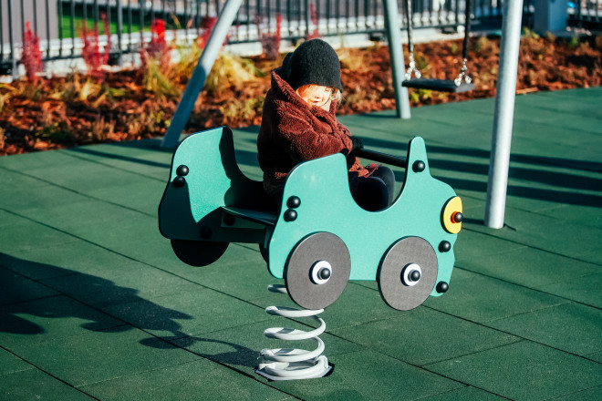 Double Auto Spring Rider je vhodný pre deti od 1 roka a jeho výška a konštrukcia sú prispôsobené na bezpečnú hru najmenších používateľov. Kritická výška pádu je nízka, čo minimalizuje riziko zranenia. Priestor okolo zariadenia je zabezpečený dostatočnou bezpečnostnou zónou a je potrebné použiť vhodný povrch na tlmenie pádov podľa platných noriem.