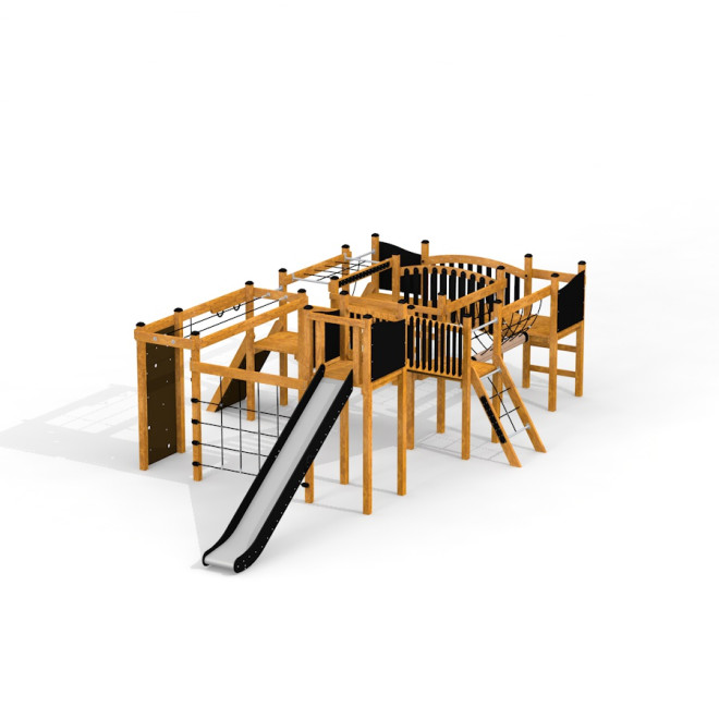 Táto herná zostava je ideálna do vonkajších priestorov škôl, detských ihrísk alebo parkov, kde podporuje fyzickú aktivitu, motorický rozvoj a spoločenskú interakciu detí. Vďaka svojmu prírodnému dizajnu sa harmonicky začlení do okolia a vytvorí príjemné miesto na hru i oddych.